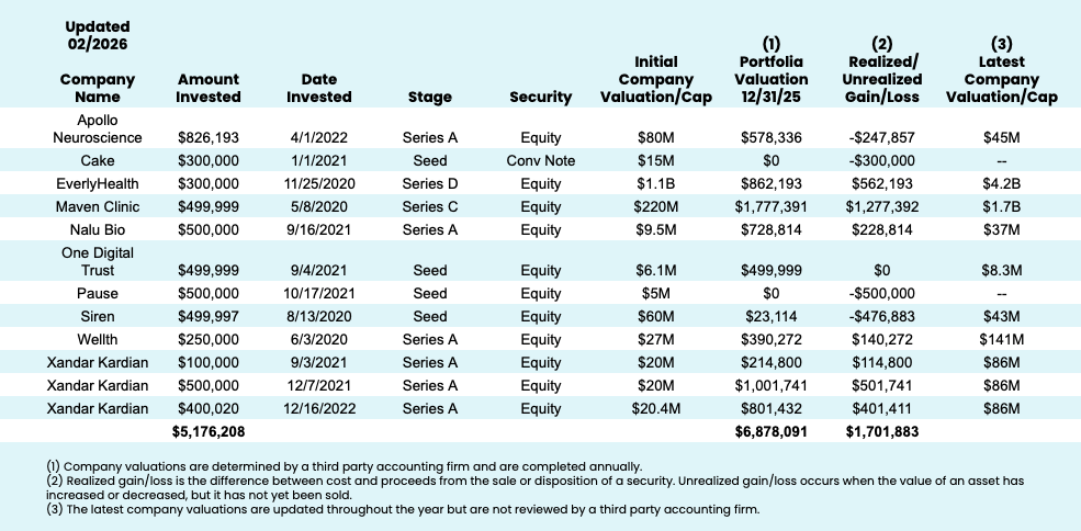 Active Aging Fund is currently at 1.19x net TPVI, meaning every $1 invested by the fund is worth $1.19, outperforming the U.S. VC market for funds of its vintage year 2020. With 8 active companies in Active Aging Fund, including Everly Health, Maven and Xandar Kardian, we expect to see significant future distributions from the fund.