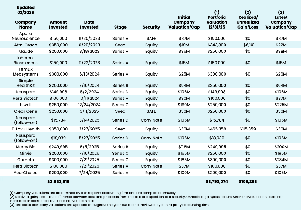 FemTech Fund III is a new 2023 vintage year fund and still deploying capital. According to Cambridge Associates, funds formed since 2023 are too young to have produced meaningful returns. FemTech Fund III invested in 9 portfolio companies as of 12/31/24 and expects to invest in a total of 14-16 companies.